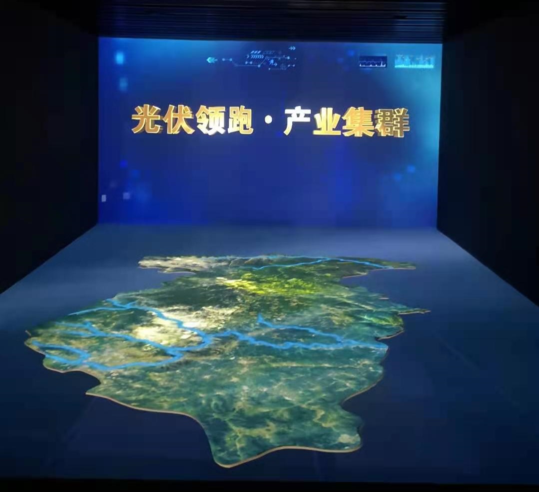 該區(qū)域為12臺投影機投射出的L型裸眼3D沙盤,展出了,鐵路和公路交通圖,礦產(chǎn)區(qū)域分布情況;以及“光伏領跑 綠色發(fā)展”主題影片,一同感受陽泉光伏領跑者示范基地一路走來的光輝歷程。