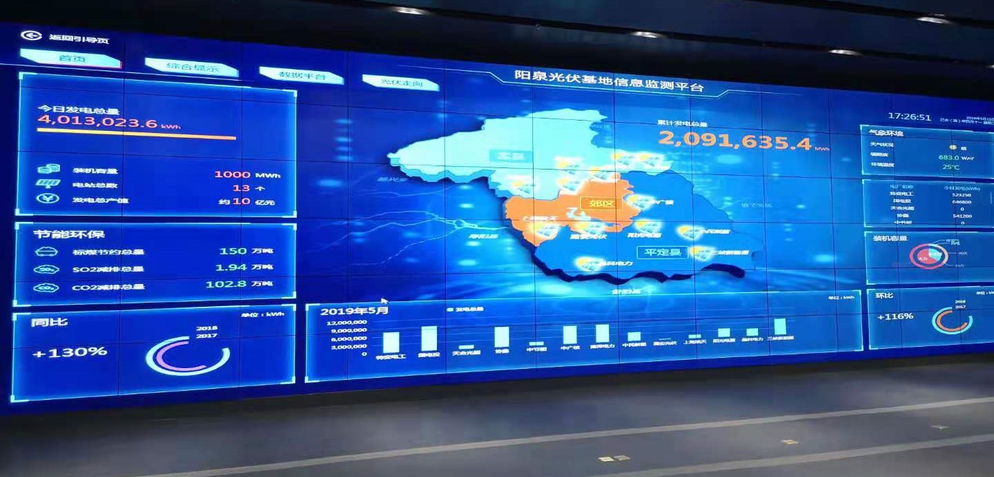 信息平臺匯集了光伏領跑者項目十三家投資商的實時發(fā)電數(shù)據(jù)、地理位置、具體信息。整個項目裝機容量為1000MW(兆瓦),年發(fā)電總產(chǎn)值約10億元。以及在建和列入開發(fā)方案的共計48萬千瓦風電項目。為拓寬平臺的服務領域,實現(xiàn)平臺的綜合化利用,該平臺除實現(xiàn)對光伏基地整體運行情況的實時監(jiān)測外,還可以通過可視會議系統(tǒng),實時連線重點工程情況。